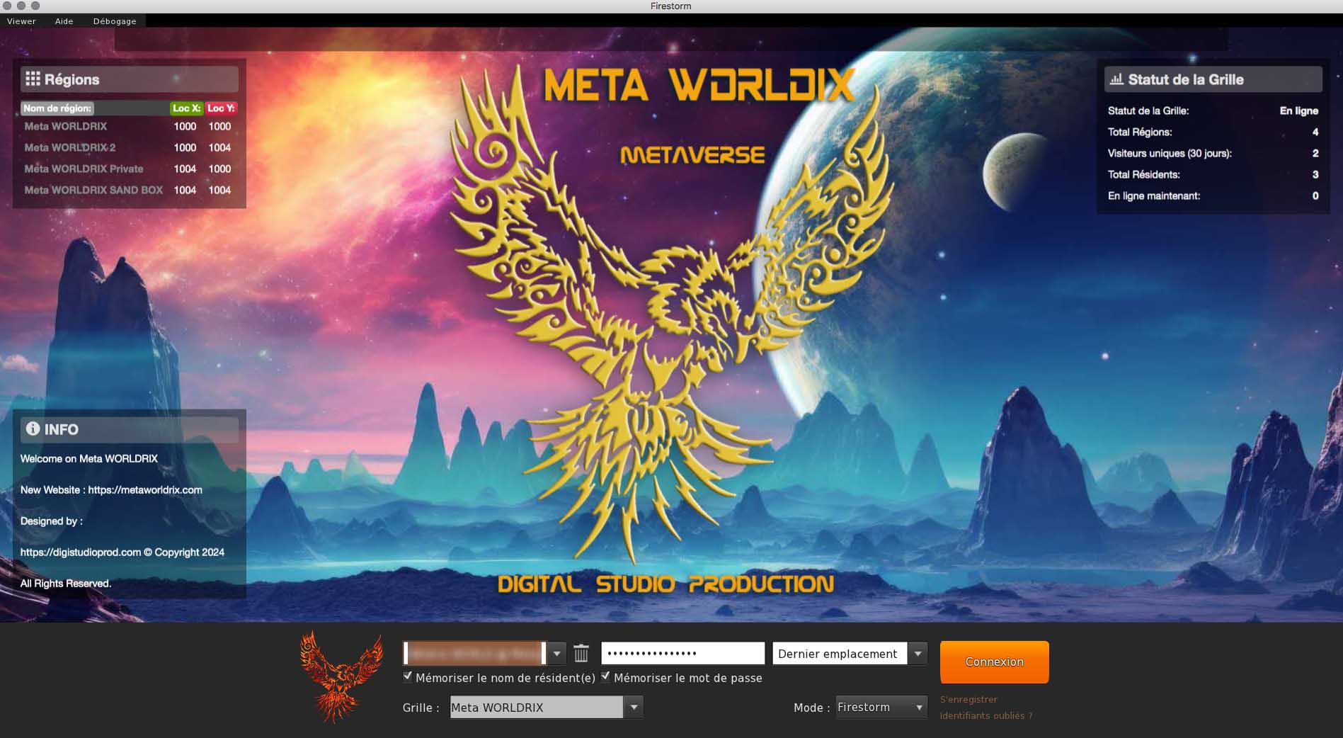Exemple connection Opensimulator :Ecran d'accueil Meta WORLDRIXSite web Meta WORLDRIX : https://metaworldrix.com